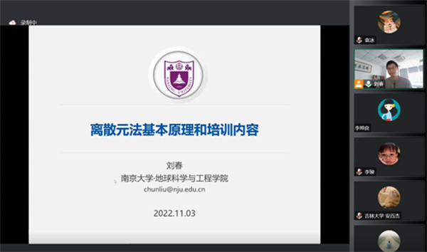 2022年11月3日,第七次离散元法与MatDEM技术培训班在京召开。培训由南京大学刘春教授组织,共有来自中南大学、北京航空航天大学、西安科技大学、中国建筑第四工程建设有限公司和中国地震局地震预测研究所等30余家单位的40余名代表参加。此次培训采用线上会议模式。