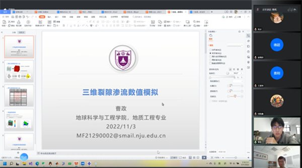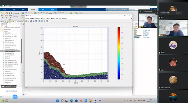 在培训课程中,刘春教授介绍了矩阵离散元的基本原理和 MatDEM 应用介绍、离散元法的宽级配建模和孔隙率控制、MatDEM 动力作用和振动过程模拟,并讲解了离散元多场和流固耦合数值模拟案例。MatDEM团队刘辉着重讲解了二维和三维滑坡灾害离散元分析以及MatDEM 二次开发接口。南京大学硕士研究生袁冰、曹政分别汇报了基于MatDEM开展的数值模拟应用,包括岩石共轭节理、三维岩体裂隙渗流模拟案例分析等方面。