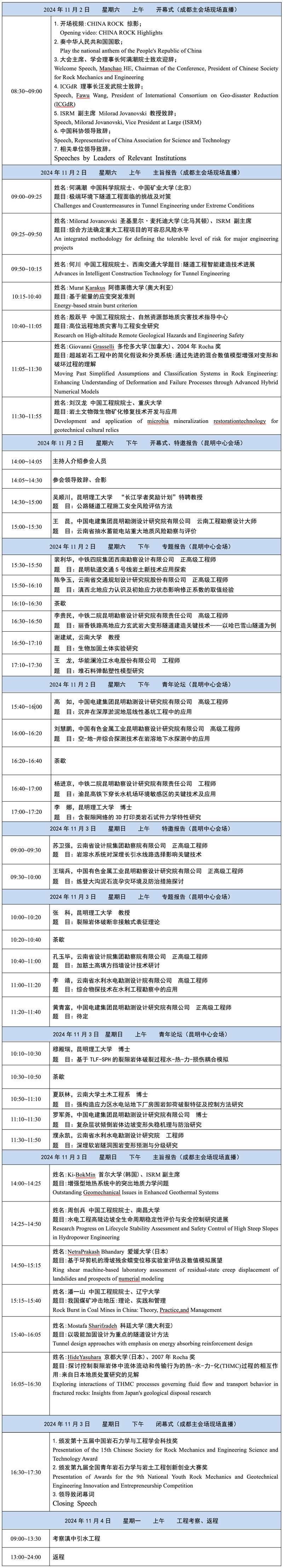 为了加强我国岩石力学与工程领域的学术交流,促进岩石力学与岩土工程领域科技创新,经研究决定,于2024年11月1-3日召开CHINA ROCK 2024 第二十一次中国岩石力学与工程学术年会。为更好地秉承“规模化、国际化、一体化”办会精神,服务好广大岩石力学与工程相关领域在校学生和青年会员,设立“主会场+中心会场+卫星会场”三级会场,成都设置主会场和分会场,在成都外设置各地中心会场,主会场及中心会场下设若干个卫星会场。其中,在昆明市设立CHINA ROCK 2024昆明中心会场。现将会场有关事项通知如下: