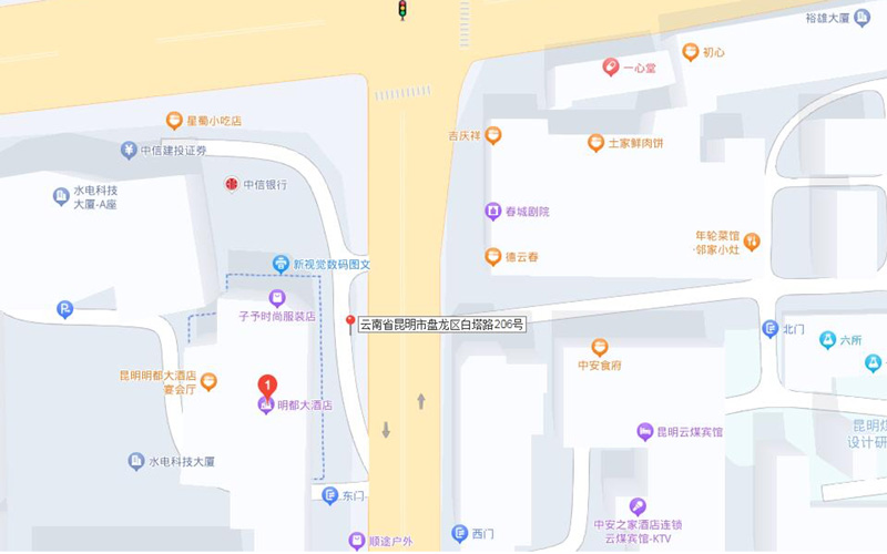 白塔路206号,明都大酒店4楼报告厅,地图如下: 昆明明都大酒店,预定房间价格:单间或标间 380元/晚。