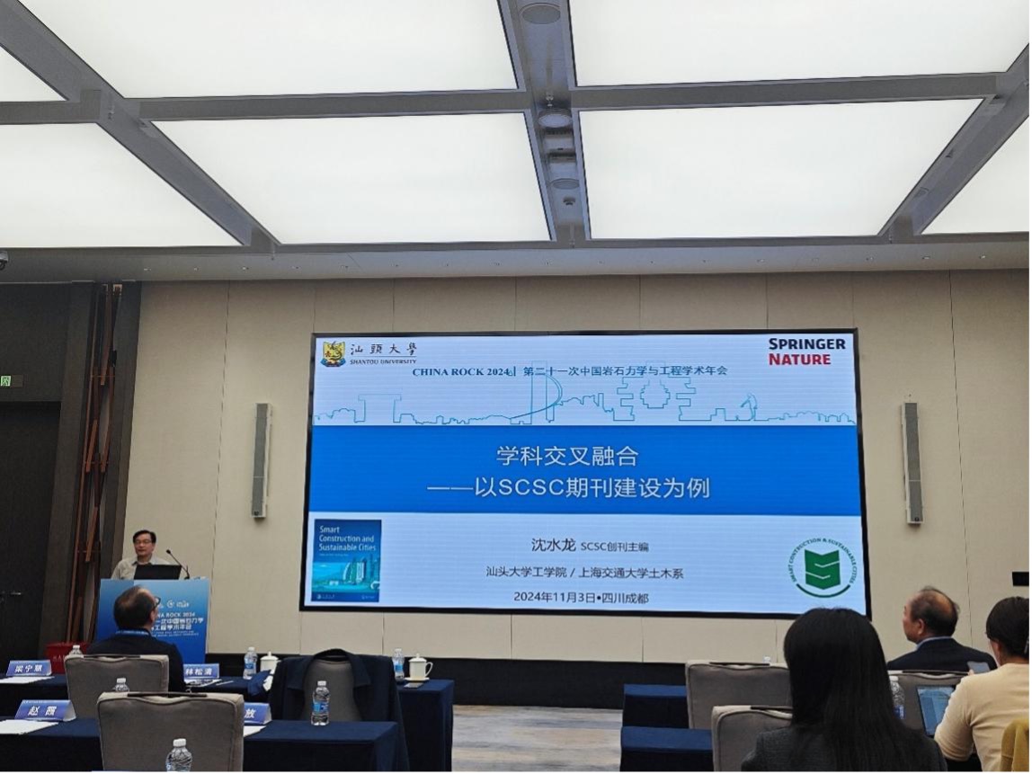 中国岩石力学与工程学会理事长、编辑工作委员会主任、《岩石力学与工程学报》和Rock Mechanics Bulletin期刊主编何满潮院士出席会议并以“开放科学与期刊重任”为题作特邀报告,强调了开放科学对于提升期刊影响力和增强学术话语权的重要性,并对岩土力学与工程地质领域期刊未来发展提出了布局规划。Deep Underground Science and Engineering主编谢和平院士通过视频致辞,预祝论坛圆满成功。汕头大学工学院院长、 Smart Construction and Sustainable Cities主编、欧洲科学院外籍院士沈水龙出席会议并作“学科交叉融合——以Smart Construction and Sustainable Cities期刊建设为例”特邀报告,分享了以学科交叉推动期刊创新发展的经验。