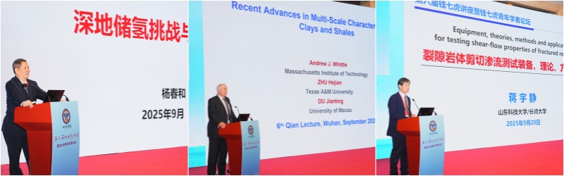 本届论坛由JRMGE主编冯夏庭教授主持。中国科学院武汉岩土力学研究所杨春和教授以“Challenges and research progress of geological hydrogen storage”为题,解析了深地储能领域核心难题与研究突破,该研究成果为盐穴储气库、储氢库建设提供了关键支撑。美国麻省理工学院Andrew J. Whittle教授围绕“Recent advances in multi-scale characterization of clays and clay shales”,分享了黏土与黏土质页岩多尺度表征研究前沿成果,其研究成果广泛应用于深海石油生产设施的基础系统设计等领域。山东科技大学特聘教授,日本长崎大学蒋宇静教授以“Equipment, theories, methods and applications for testing shear-flow properties of fractured rock masses”为题,阐述裂隙岩体实验与工程应用关键技术,并已广泛应用于隧道、矿山、水利水电等工程领域。