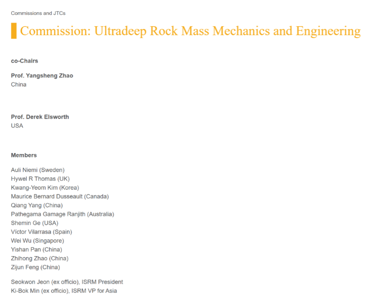 近日,我学会监事长赵阳升院士联合美国宾夕法尼亚州立大学的Derek Elsworth院士,共同创办了国际岩石力学与岩石工程学会超深岩体力学与工程专委会(ISRM Commission on Ultradeep Rock Mass Mechanics and Engineering)。该专委会由两位联合主席和来自9个国家的12位专家委员组成,旨在提供一个超深岩体力学交流与讨论的平台,交流超深地热资源和超深油气开发的新理论,以及深埋煤炭开采、超深能源存储、地质灾害预测与防治等方面的新成果和工程实践。