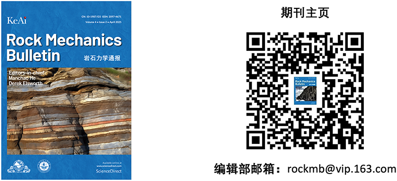 Rock Mechanics Bulletin是一本国际性、同行评审、开放获取的国产英文学术期刊,由中国岩石力学与工程学会与中国矿业大学(北京)共同创办,与科爱合作出版,由中国岩石力学与工程学会理事长、中国科学院院士何满潮教授与美国国家工程院院士Derek Elsworth教授共同担任主编。ROCKMB期刊专注于岩石力学与工程领域高质量原创性科研成果,2022年10月正式创刊,入选2022年度中国科技期刊卓越行动计划高起点新刊项目。