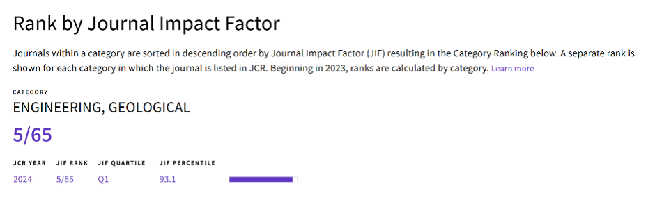 2025年6月18日,科睿唯安发布了2024年期刊引证报告(Journal Citation Reports)。中国岩石力学与工程学会与中国矿业大学(北京)共同主办的《岩石力学通报(英文)》(Rock Mechanics Bulletin,以下简称RockMB)获得首个影响因子(Impact Factor)为7.0,位于ENGINEERING, GEOLOGICAL领域 Q1区(前10%,65本期刊中排名第5)。