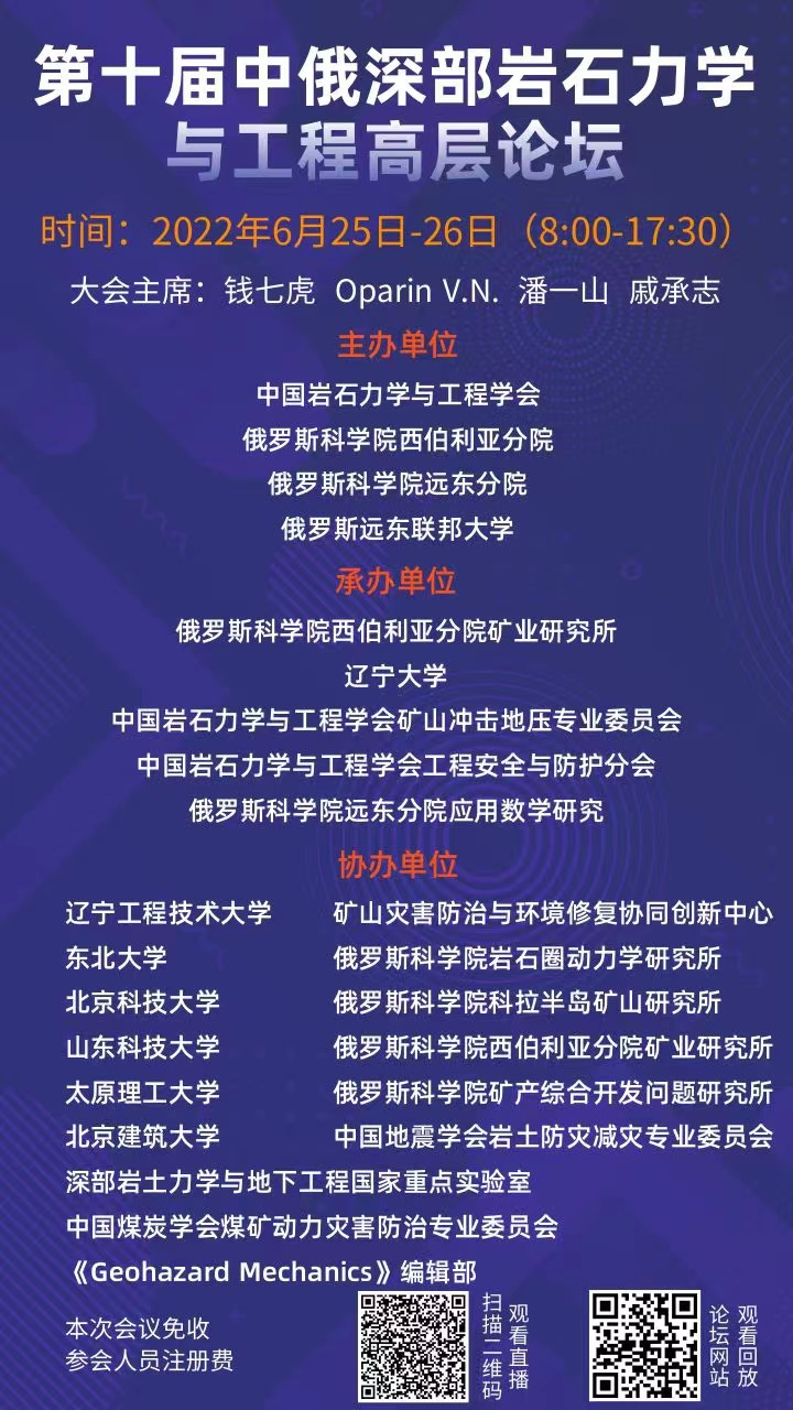 会议详情:由中国岩石力学与工程学会、俄罗斯科学院西伯利亚分院、俄罗斯科学院远东分院、俄罗斯远东联邦大学主办的"第十届中俄深部岩石力学与工程高层论坛暨中俄矿山深部开采科技联合常设论坛"定于2022年6月25日~26日以线上会议方式举行。会议旨在围绕深部岩石力学与工程领域面临的机遇与挑战,研讨岩石力学与工程的新技术、新理论和新方法等问题。会议特邀中国和俄罗斯两国的知名学者作学术报告,以便更好地推动深部岩石力学的发展,促进高端学术交流。