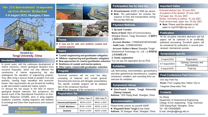 近年来,随着海洋资源的不断开发,海洋地质灾害频发,不仅影响海洋工程的建设,而且危及工程项目的运行。它们往往给人们的生命财产带来严重威胁,造成巨大的人员伤亡和经济损失,给建设安全有韧性的海岸和海洋系统提出了新的要求。为探讨海洋地质灾害减灾领域的热点问题,本届研讨会是国际地质灾害与减灾协会(International Consortium on Geo-disaster Reduction, 简称ICGdR)的年度盛会,旨在汇集学术科学家、先进工程师和学生,交流和分享他们的经验和研究成果。会议将持续两天,包括专题演讲和特邀演讲/主题演讲和专题演讲。研讨会的官方语言是英语。