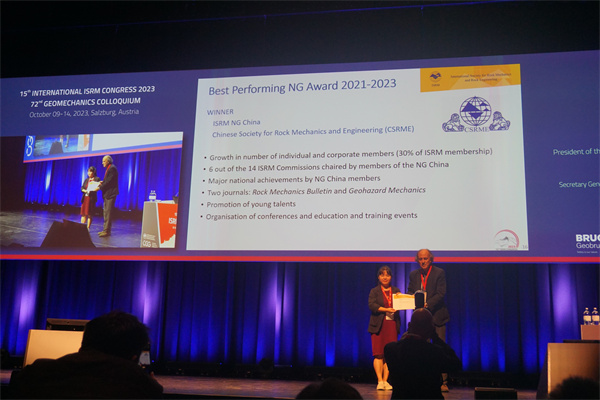在10月11日上午的开幕式上,ISRM主席Resat Ulusay教授主持。会上颁发了2023年度的罗哈奖和穆勒奖。罗哈奖和穆勒奖是国际岩石力学领域的两个重要奖项,分别表彰在岩石力学基础研究及工程技术应用方面做出杰出贡献的学者。东北大学赵骏副教授凭借其独特深入的研究,荣获ISRM一年一度的罗恰奖(Rocha Medal Award),并受邀在主会场做大会特邀报告,报告题目为"Time-dependent Failure Characteristics and Mechanism of Hard Rock in Deep Engineering"。 在13号下午大会闭幕式上,中国国家小组获得ISRM最佳国家小组奖。该奖项每两年评选一次,这是中国在2015、2017和2019年后第四次蝉联该奖项,体现了我国持续的卓越表现。此外,ISRM非连续变形分析专委会在焦玉勇和赵高峰两位主席的带领下脱颖而出,荣获四年一度的杰出专委会奖;山东大学团队以其在岩石力学与工程领域的灾变试验方法与模拟技术创新成就获得ISRM的科技创新奖;中国矿业大学(北京)的王琦教授荣获ISRM青年岩石工程师奖。会上还宣布了我学会青年工作委员会主任、同济大学张丰收教授为亚洲区副主席(VP at Large)。这一系列的荣誉标志着中国在岩石力学领域的杰出成就和国际地位的不断提升。 部分国际专委会在10-13日期间召开了工作专题会议。其中,何满潮院士主持了岩爆专委会会议,朱合华院士主持了JIC2技术专委会会议,孙晓明教授主持软岩专委会会议,王驹教授主持了核废物处置专委会会议。各个会议分别就各领域的技术难题、重大发现等进行了充分探讨。