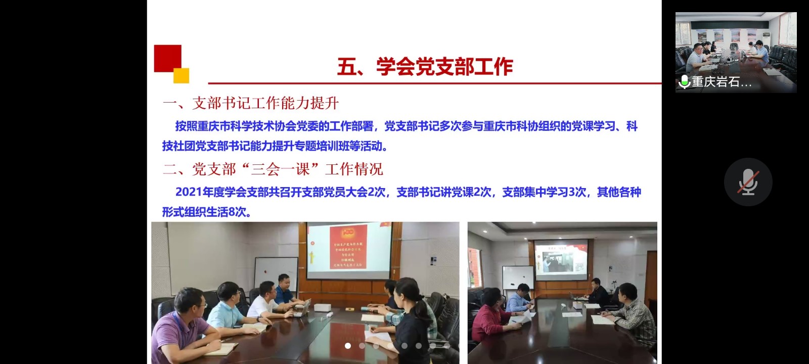 学会理事长刘新荣教授传达了中国岩石力学与工程学会何满朝理事长在全国学会理事会上作的"奋进新征程,建功新时代--学习贯彻全国两会精神"的报告内容及会议精神,并汇报了学会党支部在2021年开展的党建学习活动情况。学会号召重庆岩石力学与工程全广大理事及会员认真学习全国两会精神并积极贯彻落实。
