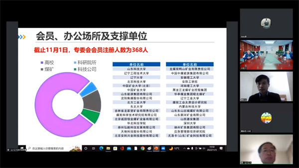 2022年11月5日晚,中国岩石力学与工程学会矿山冲击地压专业委员会第一次会员代表大会暨成立大会以线下线上相结合的形式顺利召开。来自辽宁大学、中国矿业大学、山东科技大学、辽宁工程技术大学、北方工业大学、深圳大学、北京科技大学、煤炭科学研究总院有限公司、山东能源集团有限公司、义马煤业集团股份有限公司、中国中煤能源集团有限公司的300余名从事冲击地压防治研究的会员代表通过线下线上相结合的方式参加了本次成立大会。