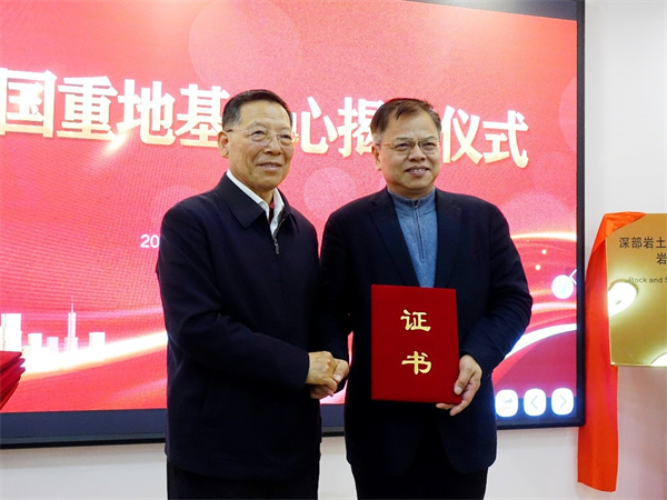 住建部科技与产业化发展中心曹吉昌处长发言指出,中心的设立不仅为部里的《岩土全生命期管理研究与示范》课题提供了落地点,也为地基中心以示范项目带动课题研究提供了有力支撑。地基中心要坚持质量效益为先,加快科技成果转化,为我国工程建设提供有力支持。 中国岩石力学与工程学会党委副书记杨晓杰教授宣读了设立地基中心的批复文件,以及聘请地基中心发展战略咨询委员会、学术委员会委员的聘任文件。 何满潮院士、刘汉龙院士、马荣全主任、李广信教授、毛志兵总工共同为地基中心揭牌。 何满潮院士为地基中心发展战略咨询委员会委员代表颁发聘书