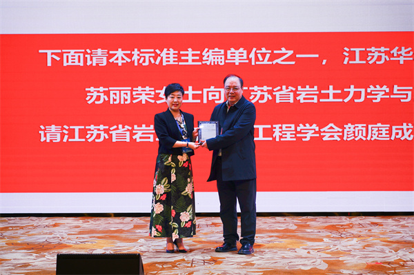 中国岩石力学与工程学会标准化技术委员会顾问秘书长黄理兴研究员宣读发布公告,并就标准编制的目的、意义及作用进行了宣贯。 江苏华岩建设有限公司董事长苏丽荣女士代表编制组向江苏省岩土力学与工程学会赠送标准文本。 标准主编袁运涛高工就本规程的主要内容、技术要点、注意事项等进行了详细解读,并与参会代表进行了深入的讨论,得到了代表们的一致好评。