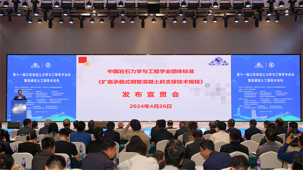 开幕式上,由江苏华岩建设有限公司及河海大学联合主编,重庆大学、苏州大学等单位参编的中国岩石力学与工程学会团体标准《扩底承载式钢管混凝土斜支撑技术规程》隆重发布。