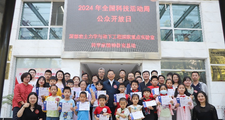 正值2024年全国科技工作者日与全国科技活动周,5月26日,“深部岩土力学与地下工程国家重点实验室科学家精神教育基地”(以下简称“基地”)开展的公众开放日活动,迎来了一批中小学生及科研工作者,共同开启了一场“弘扬科学家精神、播撒科学的种子、点亮科技智慧之光”的研学之旅。中国岩石力学与工程学会党委书记、理事长,实验室主任何满潮院士出席活动,并与参观团队合影留念,鼓励他们在今后的学习和生活中发扬科学家精神,追求科学梦想。