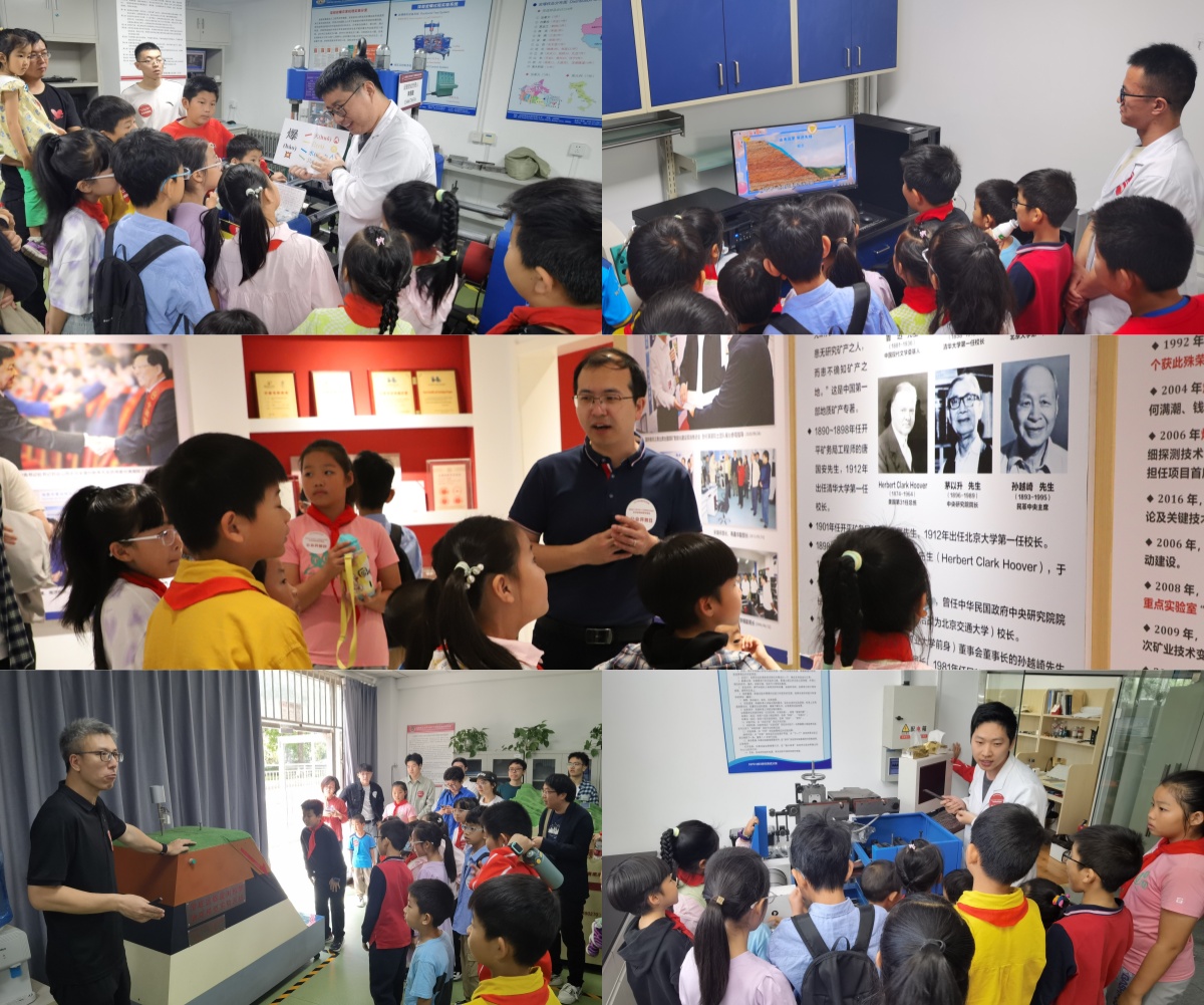 在实验室副主任刘冬桥的带领下,参观队伍漫步在深部国重实验室建设历史和发展壮大的时空里,了解地质学与力学的学科传承,聆听李四光、钱伟长、刘国昌、陈至达、谭周地等老一辈科学家的故事,学习岩土力学、地下工程的基本概念,感受科技创新带来的巨大变革。在矿业文化展板前,聆听了为我国矿业领域发展做出巨大贡献的历史名人爱国爱民、科技报国的故事。在“至达书屋”里,通过让孩子们触摸、翻看陈至达先生及其弟子的书籍、论文手稿、笔记本等科研资料,展示了陈先生对中国大变形力学学科及人才培养的杰出贡献及成为科学家的非凡历程,也展现了孩子们在课本上学不到的科学家严谨治学和人文情怀的高尚品质。