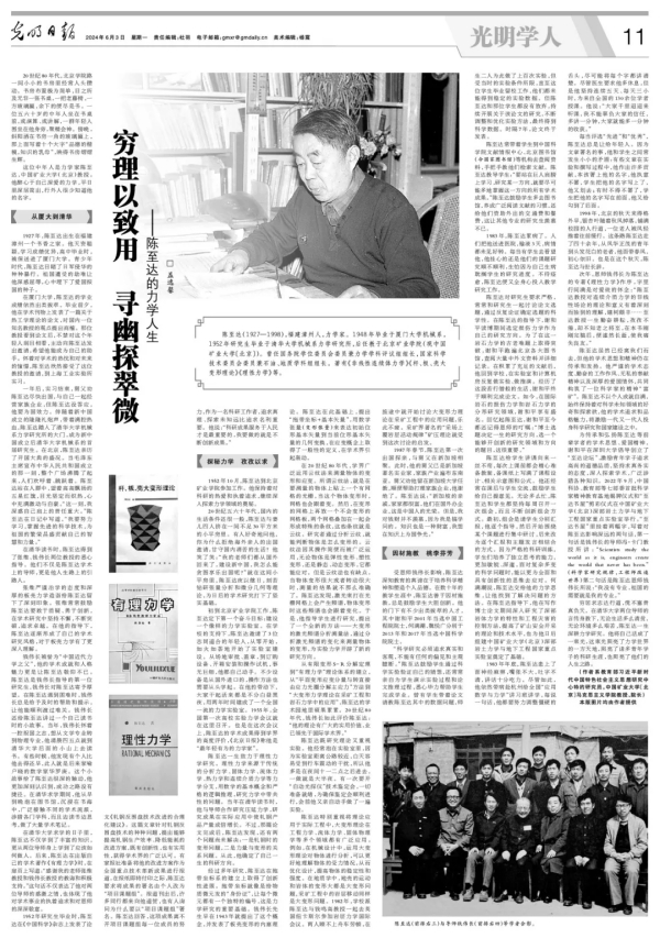 2024年6月3日,《光明日报》整版报道了中国矿业大学(北京)陈至达教授的力学人生。他一生致力于理性力学研究,为实验力学开辟了新的研究方向。他严谨的学术态度、勤奋的工作作风、无私的奉献精神以及深厚的爱国情怀,共同构筑了一位科学家的精神“富矿”。他注重培养学生的科学精神,鼓励创新,激励一代又一代人投身科学研究和国家建设之中。 陈至达(1927-1998),福建漳州人,力学家。1948年毕业于厦门大学机械系,1952年研究生毕业于清华大学机械系力学研究所,后任教于北京矿业学院(现中国矿业大学(北京))。曾任国务院学位委员会委员兼力学学科评议组组长,国家科学技术委员会委员兼石油、地质学科组组长。著有《非线性连续体力学》《杆、板、壳大变形理论》《理性力学》等。