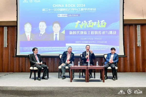 2024年11月2日下午,由地质工程技术工作委员会和青年工作委员会联合举办的ChinaRock 2024“大师面对面”座谈活动于四川省成都市天府国际会议中心成功举行。本次大师面对面座谈会活动是“百名科学家讲党课”活动之一,以“新时代地质工程的传承与挑战”为主题,邀请了三位全国工程勘察设计大师与青年地质工程学者互动交流,他们分别是中机国际工程设计研究院有限责任公司张炜大师,黄河勘测规划设计研究院有限公司李清波大师,浙江省工程勘察设计院集团有限公司蒋建良大师。三位大师们结合他们的职业和人生经验,为工程地质行业的青年学者如何更好地成长提供思路和启发。