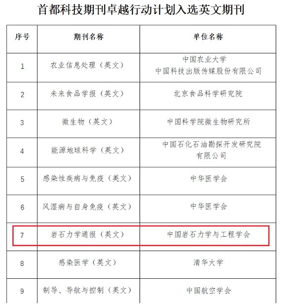 首都科技期刊卓越行动计划是北京市科学技术协会贯彻落实《关于深化改革培育世界一流科技期刊的意见》《关于加强北京市高水平国际科技期刊建设的若干措施》等文件精神,培育世界一流科技期刊、助力首都国际科技创新中心建设的核心举措。本次评选历经公开申报、形式审查、定量计分、专家评审等多轮严格筛选,最终确定入选名单。RockMB凭借在岩石力学领域的深厚积淀与创新实践,从众多申报期刊中脱颖而出,成功跻身卓越期刊行列。