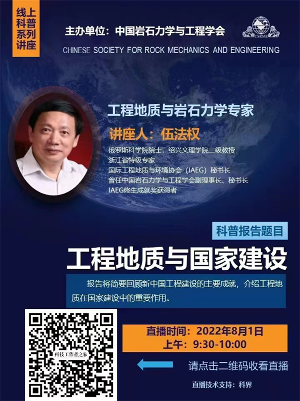 本次会议特别邀请到俄罗斯科学院院士、绍兴文理学院伍法权教授做科普报告"工程地质与国家建设",伍院士以生动的语言讲述了我国工程建设从无到有的历史,以及工程地质及岩石力学在工程建设中的作用。科普报告通过中国科协科界平台进行了网络直播,在线收看直播达到3万2千多人次。会议还组织与会代表参观了绍兴文理学院的深部国重岩石力学与地质灾害实验中心,伍法权院士亲自为与会代表进行了讲解和演示,与会代表表示又上了一堂生动的科普课,对能装在箱子里的岩土测试仪器产生了浓厚的兴趣,感受到科学家十年磨一剑的艰辛。