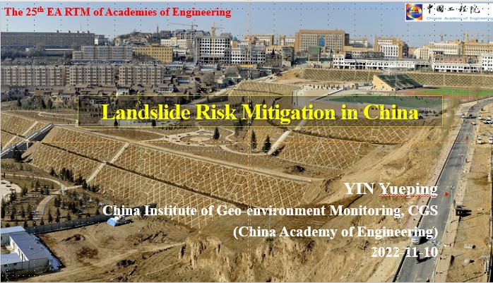 2022年11月10日,第25届中日韩工程院圆桌会议(East Asia Round Table Meeting of Academies of Engineering,简称EA-RTM)在线上召开,会议主题为"应对气候变化的防灾减灾",设立了"流域洪水预报和防汛前沿"、"滑坡灾害预测与减灾措施的前沿"和"预测与减灾水害的其他先进措施"三个议题。中国岩石力学与工程学会副理事长、滑坡与边坡分会理事长殷跃平研究员受中国工程院土木、水利和建筑学部推荐,应邀作了题为"中国滑坡减灾战略研究"的学术报告,介绍了我国丘陵山地、黄土高原、西南岩溶山地和青藏高原地质灾害的成灾机理,早期识别,监测预警和三峡库区地质灾害风险管控等防灾减灾的成效,并在讨论阶段就风险减缓和监测预警等发表见解。