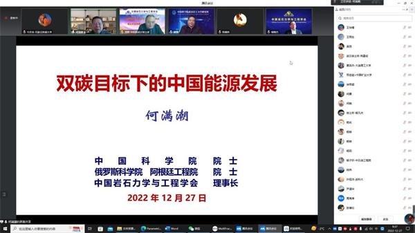 2022年12月27日上午,中国岩石力学与工程学会低碳能源岩石力学与工程专业委员会成立大会暨第一次会员代表大会成功召开。来自中科院武汉岩土力学研究所、同济大学、四川大学、中国矿业大学、清华大学、中国石油大学、成都理工大学、石家庄铁道大学、西南科技大学、中国石油集团工程技术研究院、中国地质科学院水文地质环境地质研究所、中石化新星(北京)新能源研究院有限公司、中石油西南油气田公司页岩气研究院等相关高校、科研院所、企事业单位的会员代表近300人以线上方式参加了成立大会。成立大会开幕式由中科院武汉岩土所周辉研究员主持。