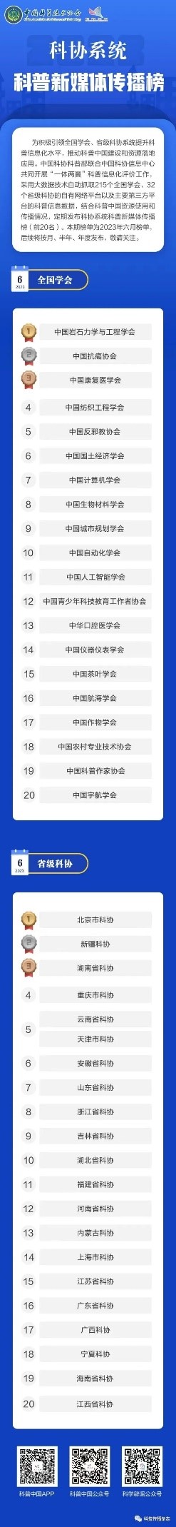 近日,中国科协发布2023年6月科协系统科普新媒体传播榜,中国岩石力学与工程学会荣登全国学会榜首。"科协系统科普新媒体传播榜"是中国科协科普部联合中国科协信息中心共同开展"一体两翼"科普信息化评价工作,采用大数据技术自动抓取215个全国学会、32个省级科协的自有网络平台以及主要第三方平台的科普信息数据,结合科普中国资源使用和传播情况定期进行评价。