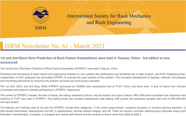 "岩石破坏短临预报"竞赛由赵阳升院士倡导,现已作为"陈宗基讲座"的组成部分持续在太原理工大学举办。"岩石破坏短临预报"是人类面对的岩体系统重大工程与自然灾害的核心科学问题。岩石破坏短临预报竞赛旨在通过竞赛的方式引导中国、乃至全世界岩体力学与工程学者关注这一问题并激发创新灵感,使各国学者们了解在非线性岩体力学理论、方法、技术与监测仪器水平全方位的彼此差异与不足,进而提升岩体系统的岩爆、煤与瓦斯突出、滑坡、地震等重大工程与自然灾害预测预报理论、技术水平与防灾减灾的能力。该竞赛自2021年创办以来,在国内外产生了重要影响。2023年3月国际岩石力学与工程学会(ISRM)在官网主页报道了第-、二届"岩石破坏短临预报竞赛"(详情请点击链接https://isrm.net/newsletter/show/240#short-term-prediction-of-rock-failure-competitions-held-in-taiyuan-china),引起了国际同行的密切关注。 本届竞赛通知发出后,得到了国内各高校、科研院所的积极响应,多个国外研究团队邮件咨询,并表达了参赛意愿。经过竞赛组委会认真审查、讨论,最终确定清华大学、同济大学、大连理工大学、辽宁大学、北方工业大学、成都理工大学、青岛大学、河南理工大学、中科院武汉岩土力学研究所、天地股份有限公司深地研究院等10支代表队参加本次竞赛,参赛队员有本科生、硕士生、博士生、教师和高级工程师。