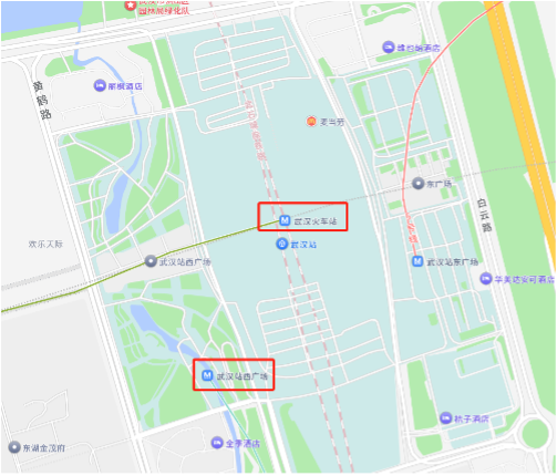 注:地铁站武汉火车站和武汉站西广场站为2个地铁站,都在高铁武汉火车站但不互通,需要站外换乘(刷公交卡/支付宝可实现虚拟换乘),步行距离约10分钟。