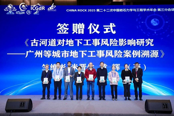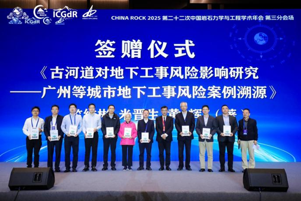 随后举行了《古河道对地下工事风险影响研究——广州等城市地下工事风险案例溯源》新书签赠仪式。出版社陈志敏总编向以竺维彬、米晋生、黄辉为主编的作者团队致贺。陈总编赞誉该力作是团队三十余年实践智慧的结晶,为地下工程风险控制指明了方向,并称其成功出版是双方携手促进行业发展的又一里程碑,展望未来合作前景。
