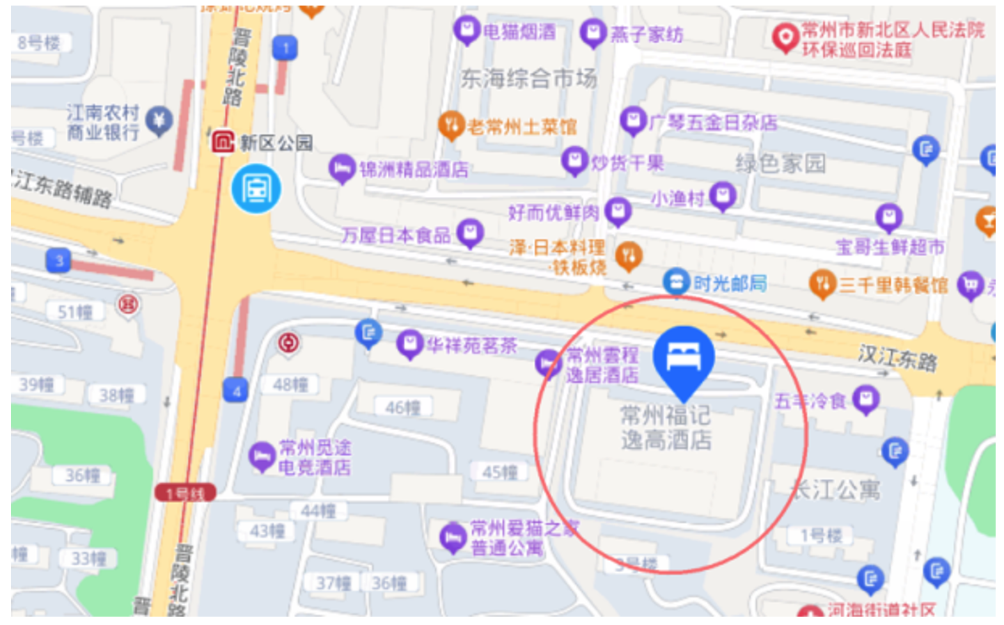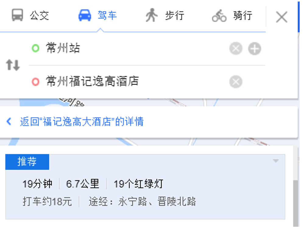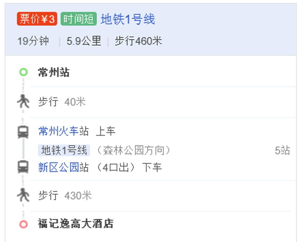 从常州北站乘坐地铁1号线前往常州福记逸高大酒店,距离约6公里,耗时约19分钟,花费约3元。