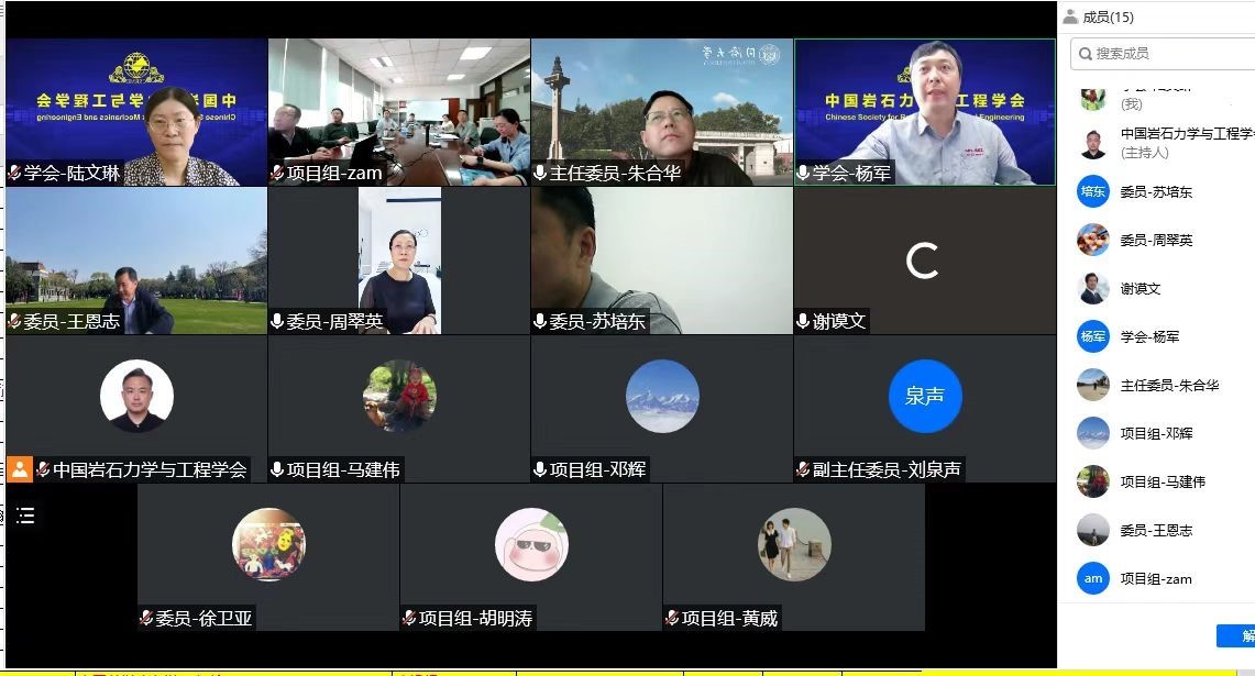 中国工程院院士、同济大学朱合华教授担任评价委员会主任,武汉大学刘泉声教授担任副主任,评委会专家有:河海大学徐卫亚教授、中山大学周翠英教授、清华大学王恩志教授、北京科技大学谢谟文教授、西南石油大学苏培东教授,学会常务副秘书长杨军教授主持会议。
