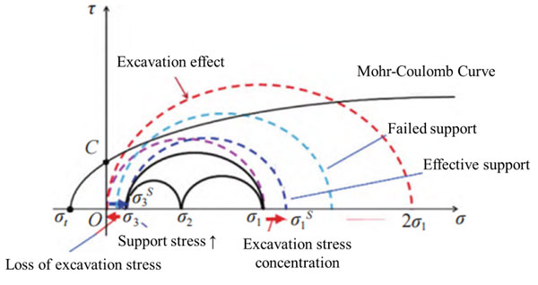 Due to the deep burial depth and high in-situ stress of the Qinling Tunnel, traditional rock control methods, typically designed for shallow and mid-depth excavation, are inadequate for rock burst management in such deep underground projects. To address this, academician Manchao He and his team proposed an innovative excavation compensation theory[4]. This theory posits that prior to excavation, the surrounding rock remains in a stable state, with stress levels below the Mohr-Coulomb strength envelope. However, excavation disrupts the stress equilibrium, causing a reduction in radial stress to zero and an increase in tangential stress. This leads to unbalanced stress unloading in one direction, triggering the expansion of the Mohr stress circle, deformation, instability of the surrounding rock, and ultimately rock bursts[5]. Figure 2 shows the excavation stress compensation model.