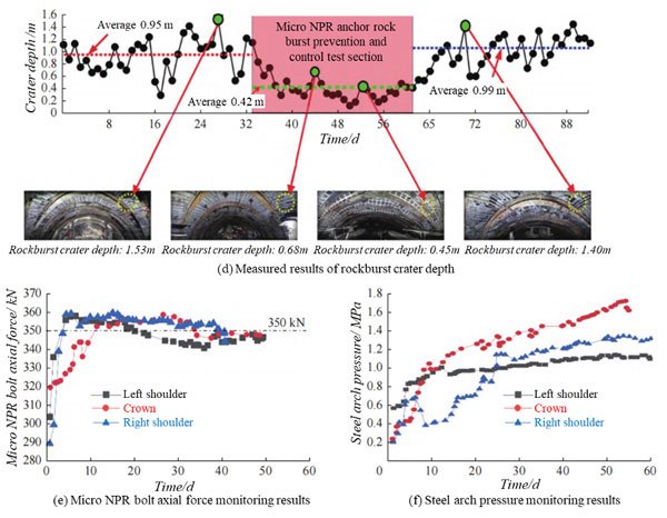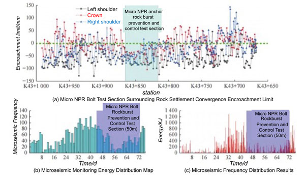 Based on the excavation compensation theory and second-generation micro NPR bolts, a three-dimensional NPR high-stress compensation support system was developed. This system integrates radial micro NPR bolts, axial flexible nets, and circumferential W-shaped steel strips, effectively mitigating rock burst hazards. Field monitoring data from the trial section (K43+865 to K43+815) revealed significant reductions in microseismic energy and frequency, improved integrity of the surrounding rock, decreased depth of bursting pits, and reduced deformation and stress on steel arches, underscoring the efficacy of the support system (Figure 4).