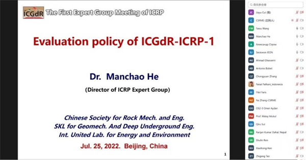 As the Director of the expert group, Prof. Manchao He presented the "Evaluation Policy of ICGdR-ICRP-1", and explained the operation mechanism of the International Correlation Research Program and its evaluation process. The Policy was unanimously approved by all the members of the expert group.
